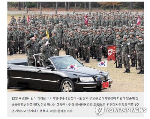 그리고 얼마 후 우오현 회장 님이 투스타 모자를 쓰고 장병들의 열병을 했습니다. 어느 기사에 따르면 민간인은 최고 대령 우대인데, 이 사람은 명예사단장이 되었다고 얘기했습니다.